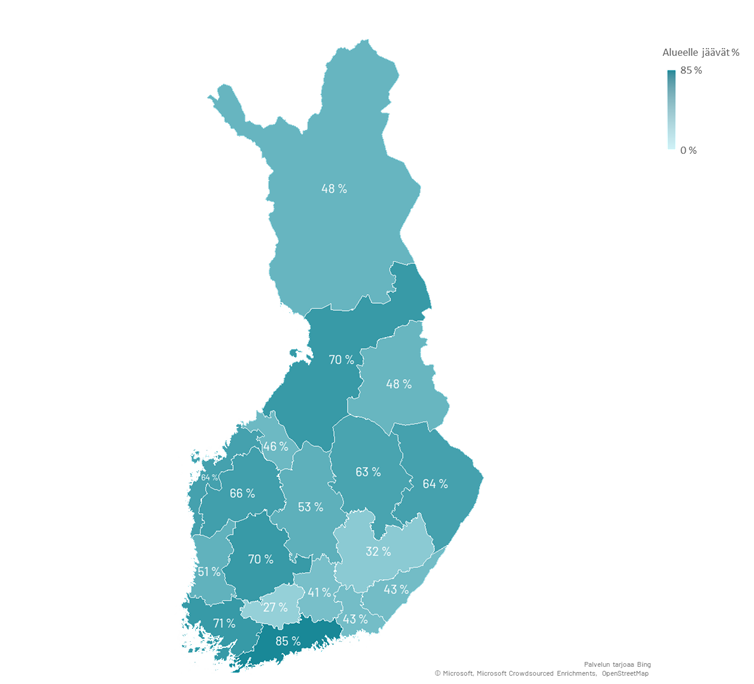 Vastaavasti vahvimmin korkeakoulusta valmistuvat sijoittuvat opiskelumaakuntaansa Varsinais-Suomessa (70,6 %), Pohjois-Pohjanmaalla (70,3 %) ja Pirkanmaalla (70,1 %) ja erityisen vahvaa sijoittuminen opiskelumaakuntaansa on Uudellamaalla (84,5 %). On toki tarpeen huomioida, että tutkinnon kirjautuessa hallinnollisesti korkeakoulun kotimaakuntaan, mutta opiskelu ja työllistyminen tapahtuvat toisella alueella, tilasto ei täysin tavoita alueellisen pidon todellista dynamiikkaa. Luvut saattavat näin ollen korostaa tiettyjen maakuntien vetovoimaa tai aliarvioida hajautetun koulutuksen aluevaikuttavuutta.