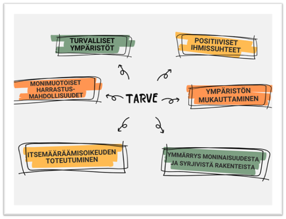 Kolmantena toimenpiteenä korostettiin ympäristön mukauttamista. Esimerkiksi aistiystävälliset tilat ja moninaisten tarpeiden huomioiminen voivat tehdä harrastamisesta saavutettavampaa ja mielekkäämpää erilaisille osallistujille.
