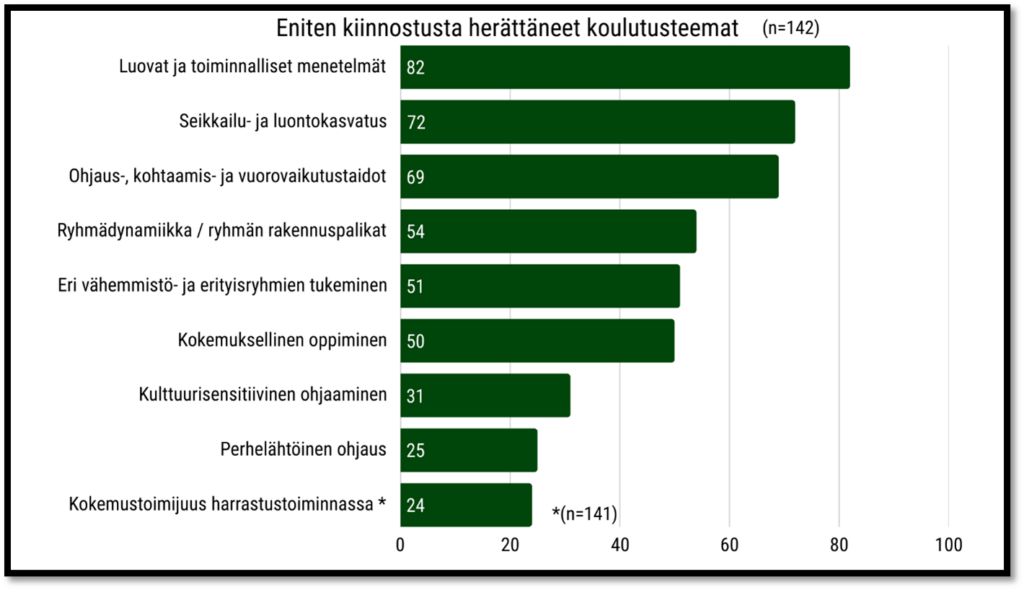 Harrastustoiminnan ohjaajille suunnatussa kyselyssä ja työpajoissa korostui tarve kiinnittää lasten ja nuorten harrastus- ja vapaa-ajantoiminnassa nykyistä enemmän huomiota osallisuuden vahvistamiseen, ohjaajien ammatillisen osaamisen kehittämiseen, yksilöllisten tarpeiden tunnistamiseen, moninaisuuden huomioimiseen sekä resilienssin tukemiseen. Eniten kiinnostusta herättivät koulutusteemat, jotka liittyivät luoviin ja toiminnallisiin menetelmiin, seikkailu- ja luontokasvatukseen sekä ohjaus-, kohtaamis- ja vuorovaikutustaitojen vahvistamiseen (kuva 1).